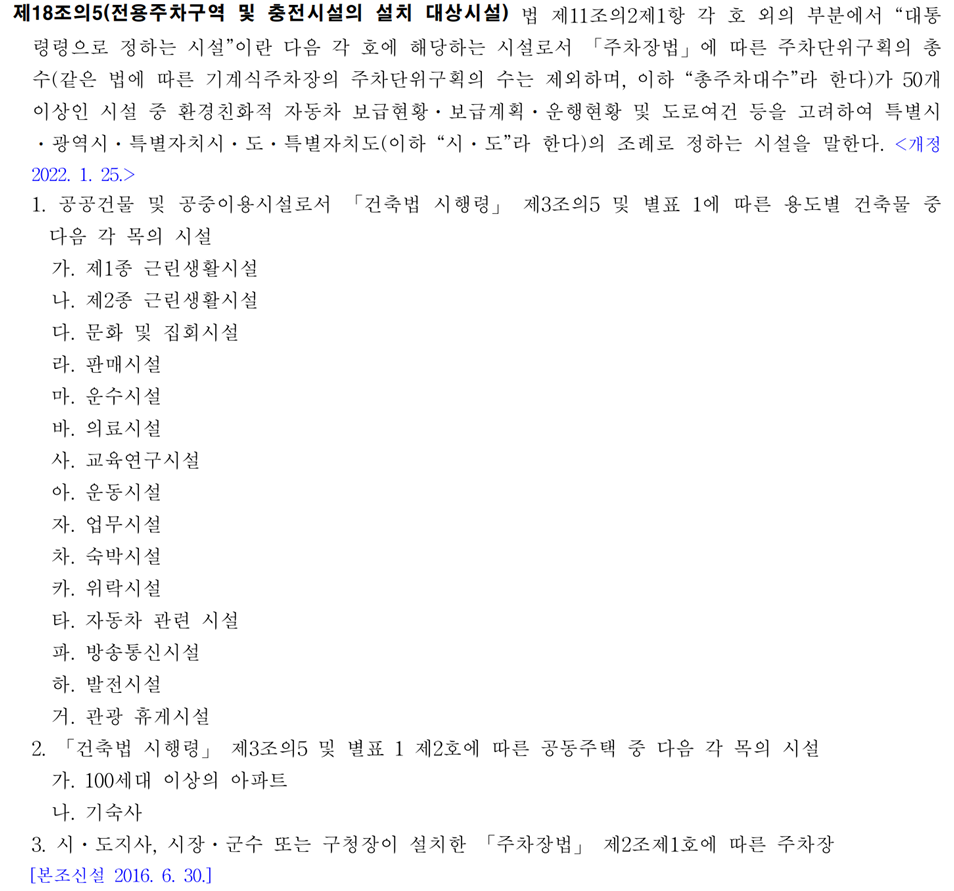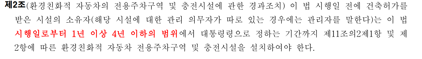 부칙 제2조에 따라 4년내에 환경친화적 자동차 전용주차구역 및 충전시설을 설치하여야 합니다.